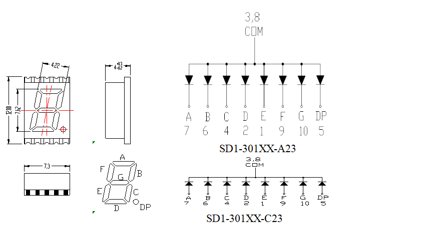 Common Anode | Common Cathode | Materials/Emmited Color | Vf(Typ.) | Iv. Typ per Seg. | ||