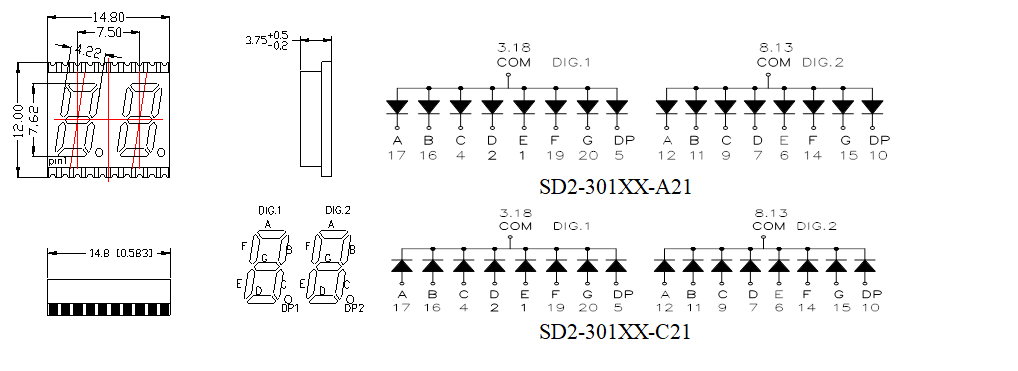 0.3" | SD2-301UR-A21 | SD2-301UR-C21 | AlGaInP/Red | 628~637 | 1.8~2.4 | 3.5 |