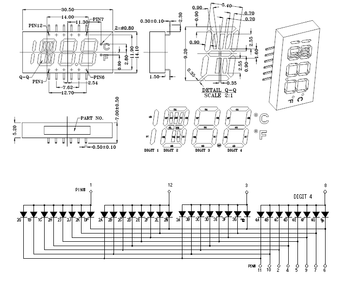 SMD display, height 0.36", four didits+2 icons, red color, black surface, white diffused segments, common anode.